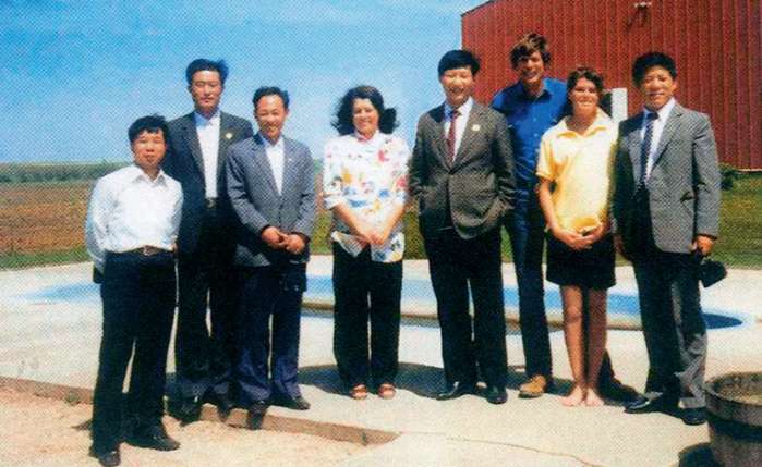 1985年,习近平(右四)到美国艾奥瓦州马斯卡廷市访问,在一个家庭农场受到热情欢迎。(图源:《习近平在正定》)